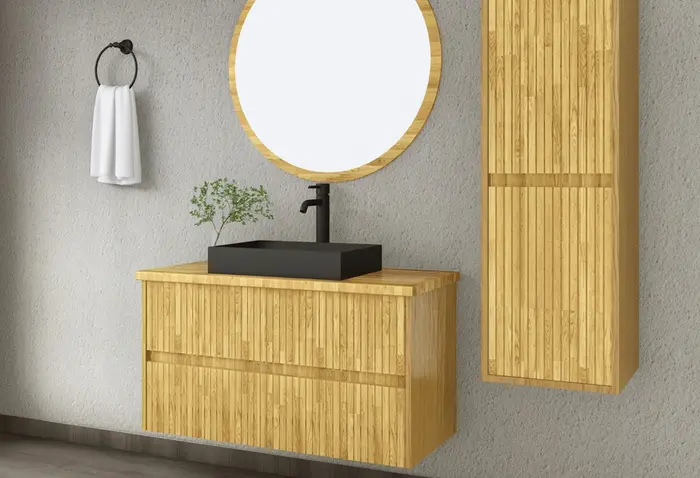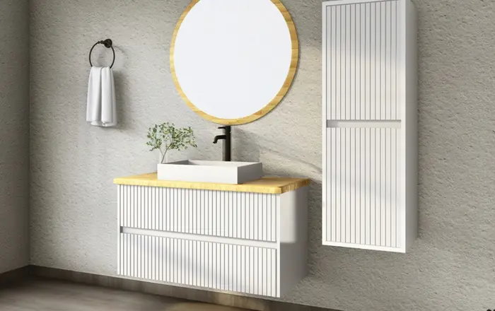 ארון אמבטיה בעיצוב סקנדינבי מודרני, המשדר תחושת טבעיות, ניקיון והרמוניה.