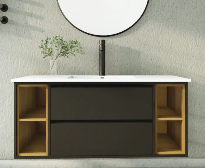 ארון POLEG משלב צבעים טבעיים עם קווים נקיים היוצרים מראה יוקרתי ונעים לעין. שילוב של גוף בגוון כהה עם מסגרת עץ אלון מוסיף חמימות ותחושת איזון מושלמת לכל חלל אמבטיה.
