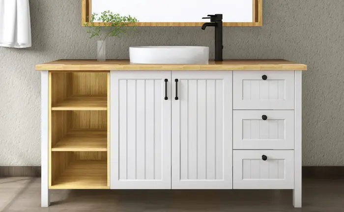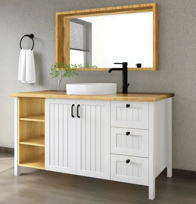 ארון אמבטיה מעוצב בקו כפרי-מודרני, שמשלב חמימות טבעית עם מראה נקי ואלגנטי.